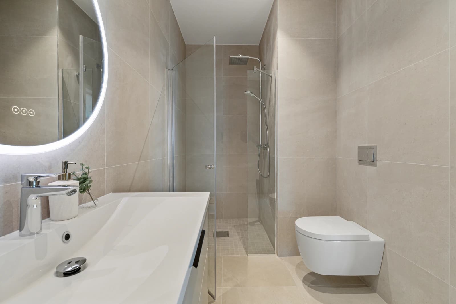- Bad leveres ferdig flislagt med 60x60 cm flis fra Modena på vegger og gulv. Det kan fritt velges mellom 5 fargevarianter som inngår i flisserien. Dusjhjørne/-dør med profiler i krom og klart glass, mosaikkflis på gulv.