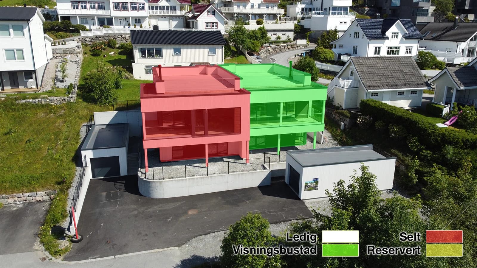 Hver bolig har parkering i egen garasje, utstyrt med garasjeport og elektrisk portåpner. I bakkant av garasjen er det en romslig sportsbod med god plass til oppbevaring av blant annet sykler, skiutstyr og mer. På området er det også gjesteparkering.
