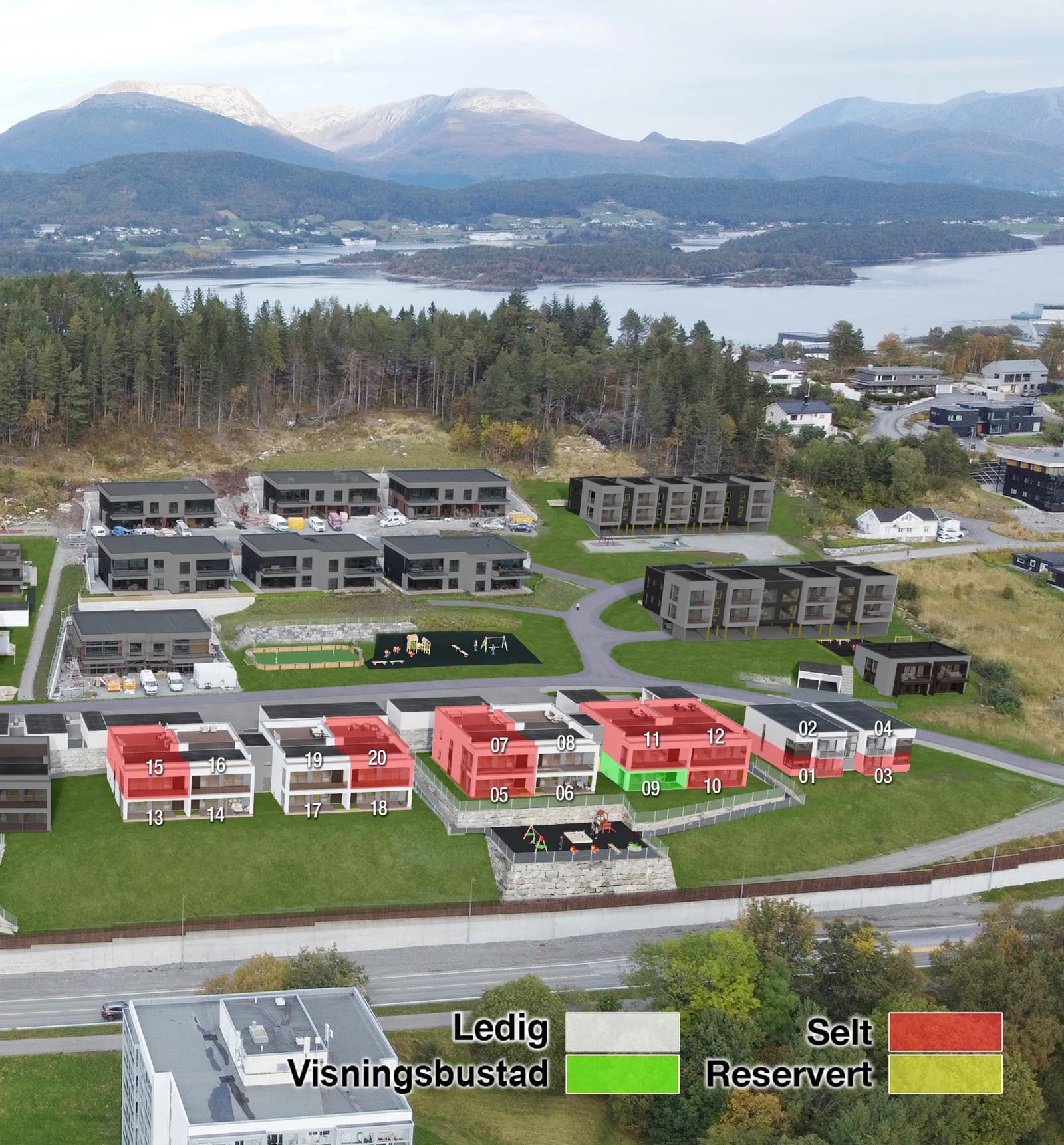 Boligfeltet har en kombinasjon av boligtyper fra store tomannsboliger med takterrasse til moderne leilighetsbygg med opp til 10 boenheter i hver bygning. For flere av boligene er det lagt til rette for livsløpsstandard og husbankfinansiering.