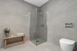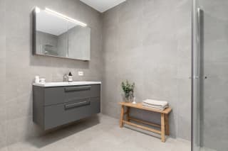 - Bad leveres ferdig flislagt med 60x60 cm flis fra Modena på vegger og gulv. Det kan fritt velges mellom 5 fargevarianter som inngår i flisserien. Dusjhjørne/-dør med profiler i krom og klart glass, mosaikkflis på gulv.