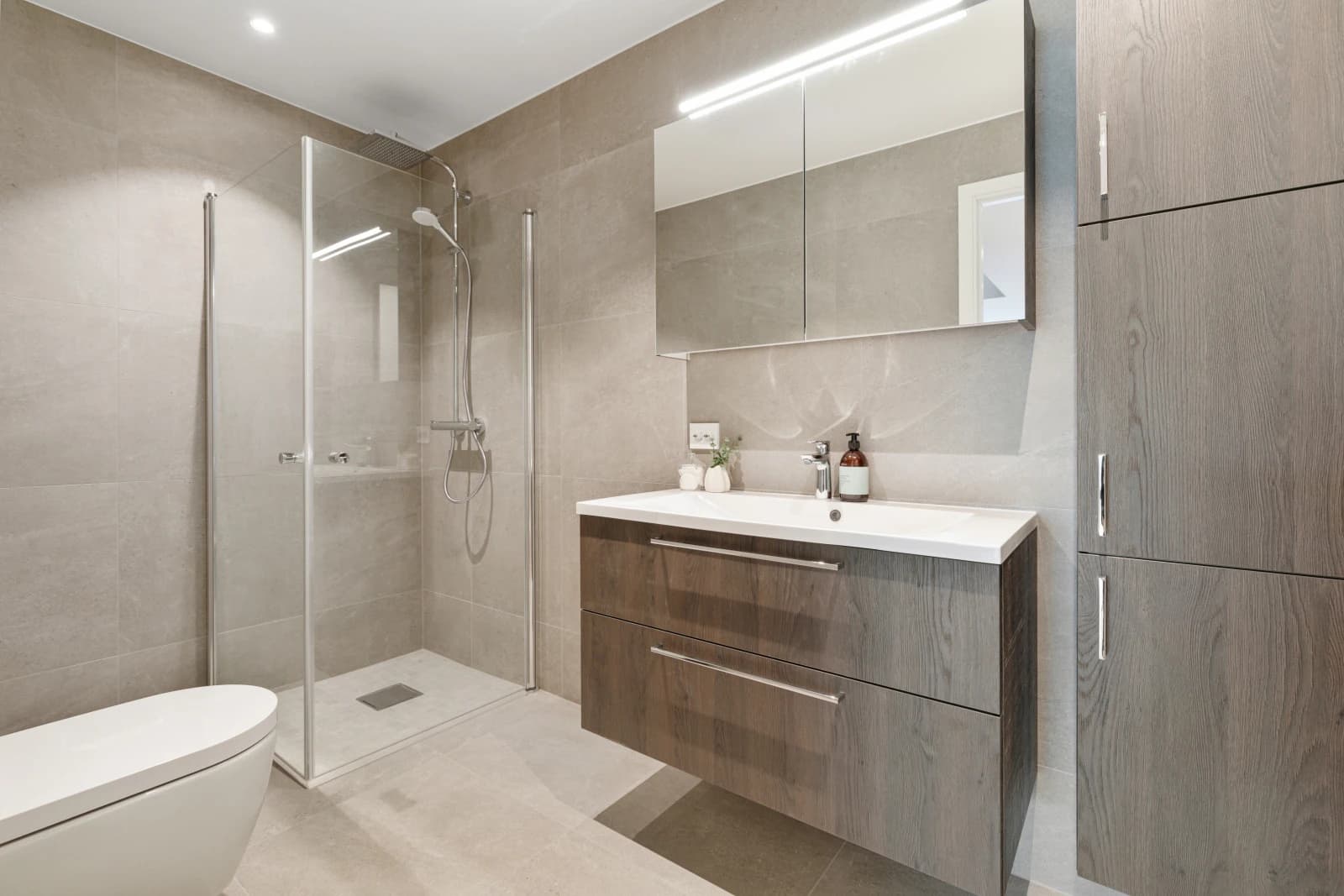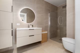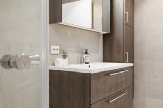 - Bad leveres ferdig flislagt med 60x60 cm flis fra Modena på vegger og gulv. Det kan fritt velges mellom 5 fargevarianter som inngår i flisserien. Dusjhjørne/-dør med profiler i krom og klart glass, mosaikkflis på gulv.