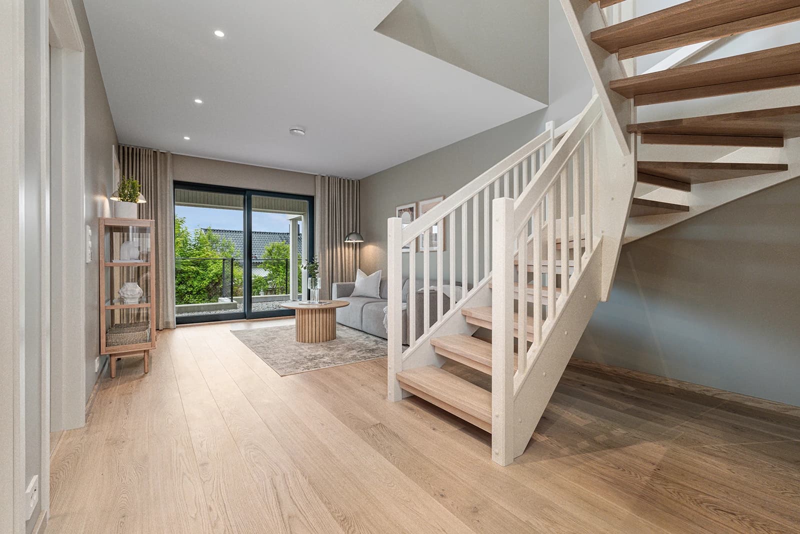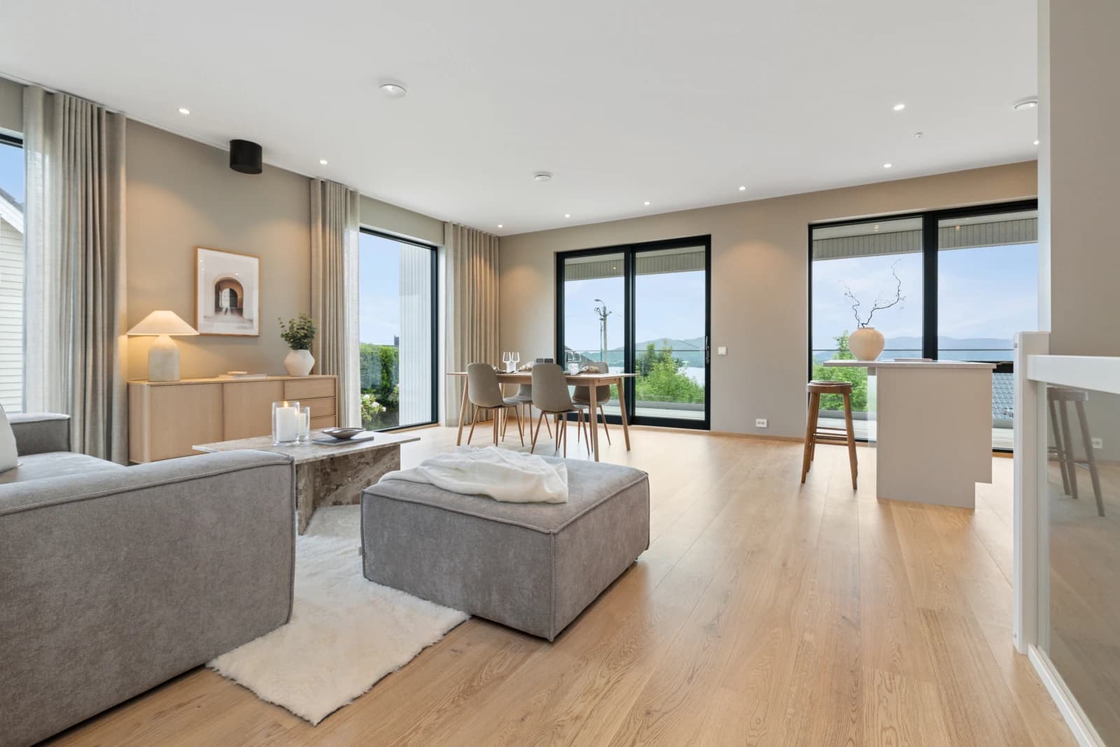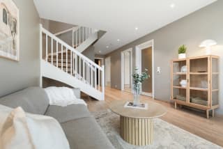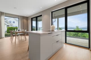 Boligene har en romslig og åpen stue- og kjøkkenløsning i overetasjen, med ekstra takhøyde og store vindusflater. Dette skaper en svært god romfølelse, perfekt for både hverdagsliv og sosiale sammenkomster.