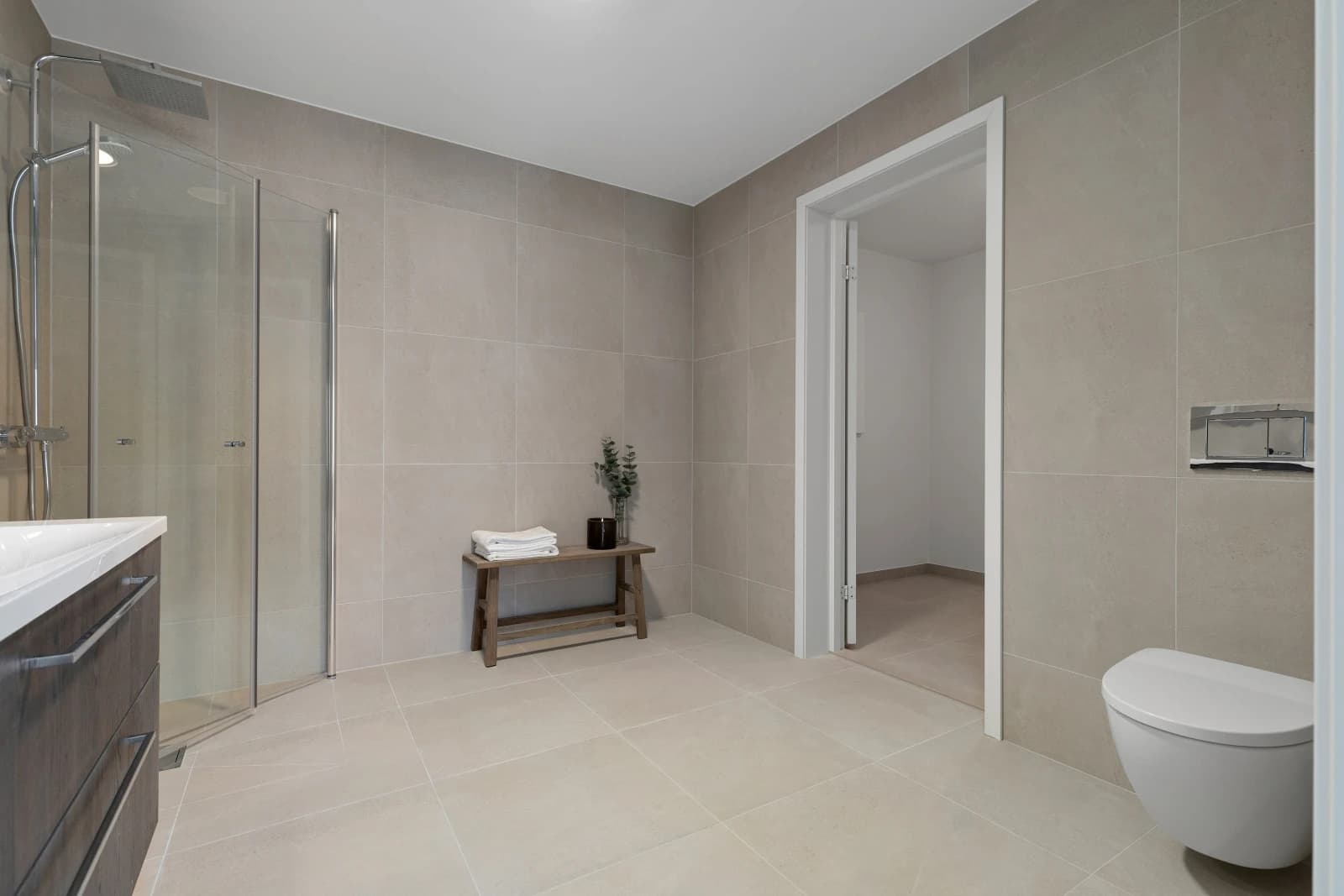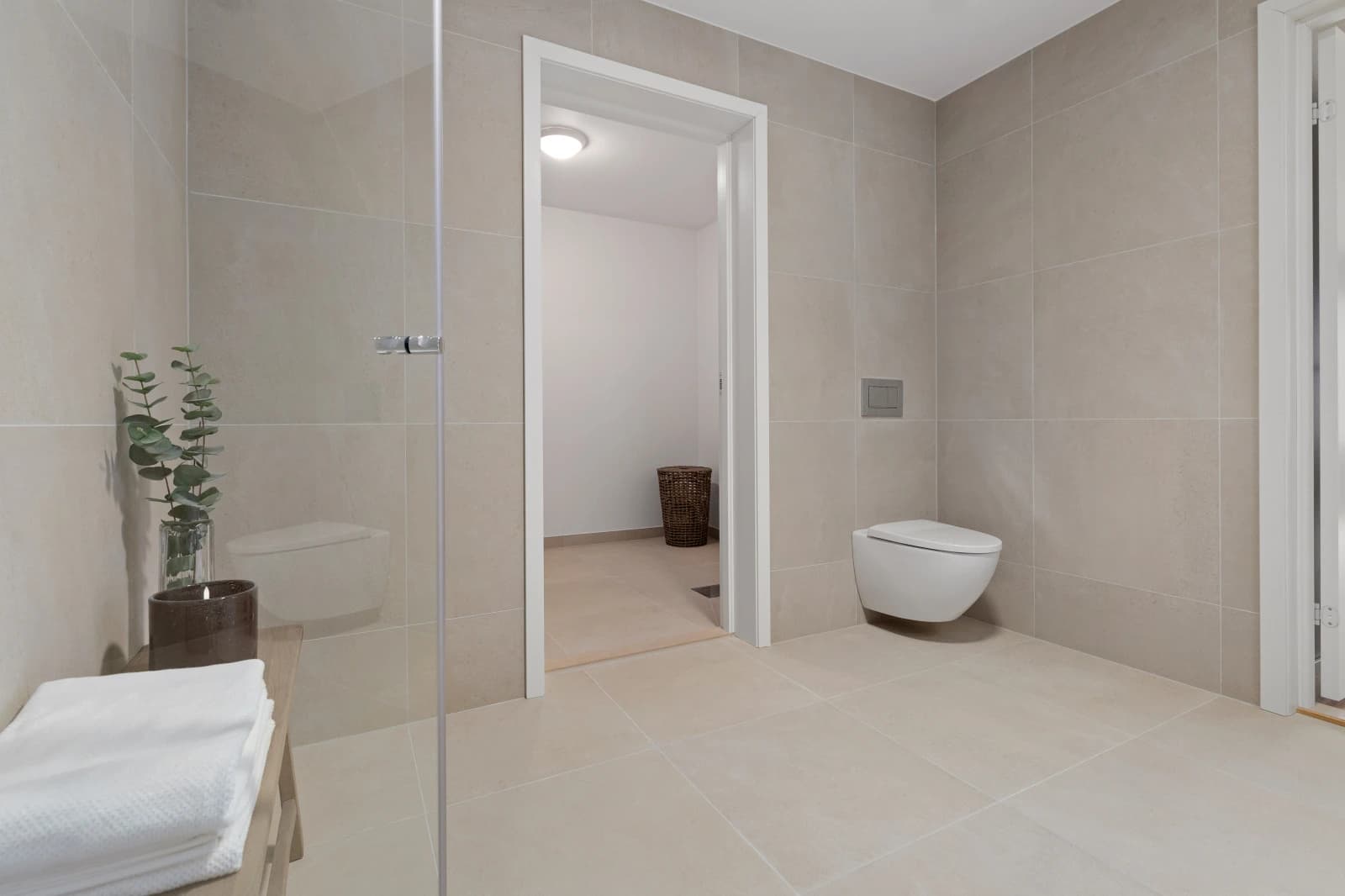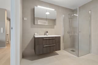 - Bad leverast ferdig flislagt med 60x60 cm flis frå Modena på veggar og golv. Det kan fritt veljast mellom 5 fargevariantar som inngår i flisserien. Dusjhjørne/-dør med profilar i krom og klart glas, mosaikkflis på golv.