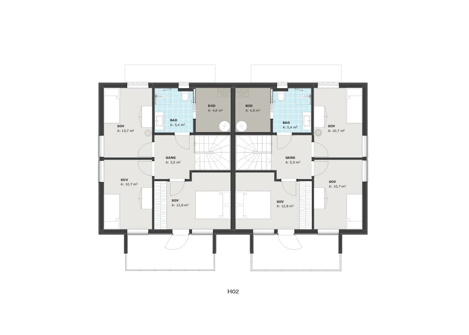I 2. etasje er det tre romslige soverom, hvor det ene har utgang til veranda. I denne etasjen er det også et bad, som har skyvedør inn til bod/teknisk rom.
