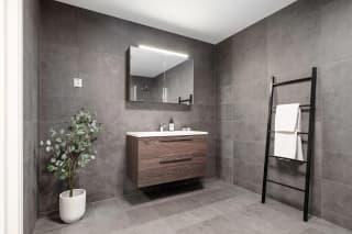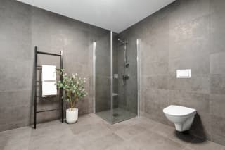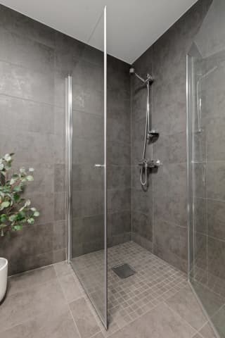 - Bad leverast ferdig flislagt med 60x60 cm flis frå Modena på veggar og golv. Det kan fritt veljast mellom 5 fargevariantar som inngår i flisserien. Dusjhjørne/-dør med profilar i krom og klart glas, mosaikkflis på golv.
