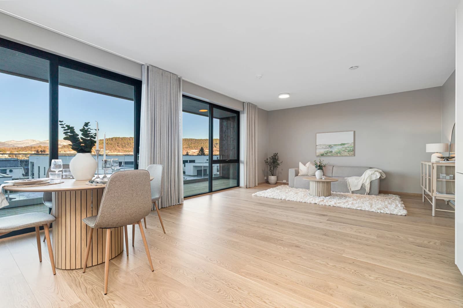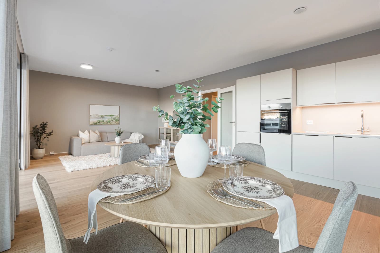 - 1-stavs eikeparkett av høy kvalitet levert på stue, kjøkken og soverom.