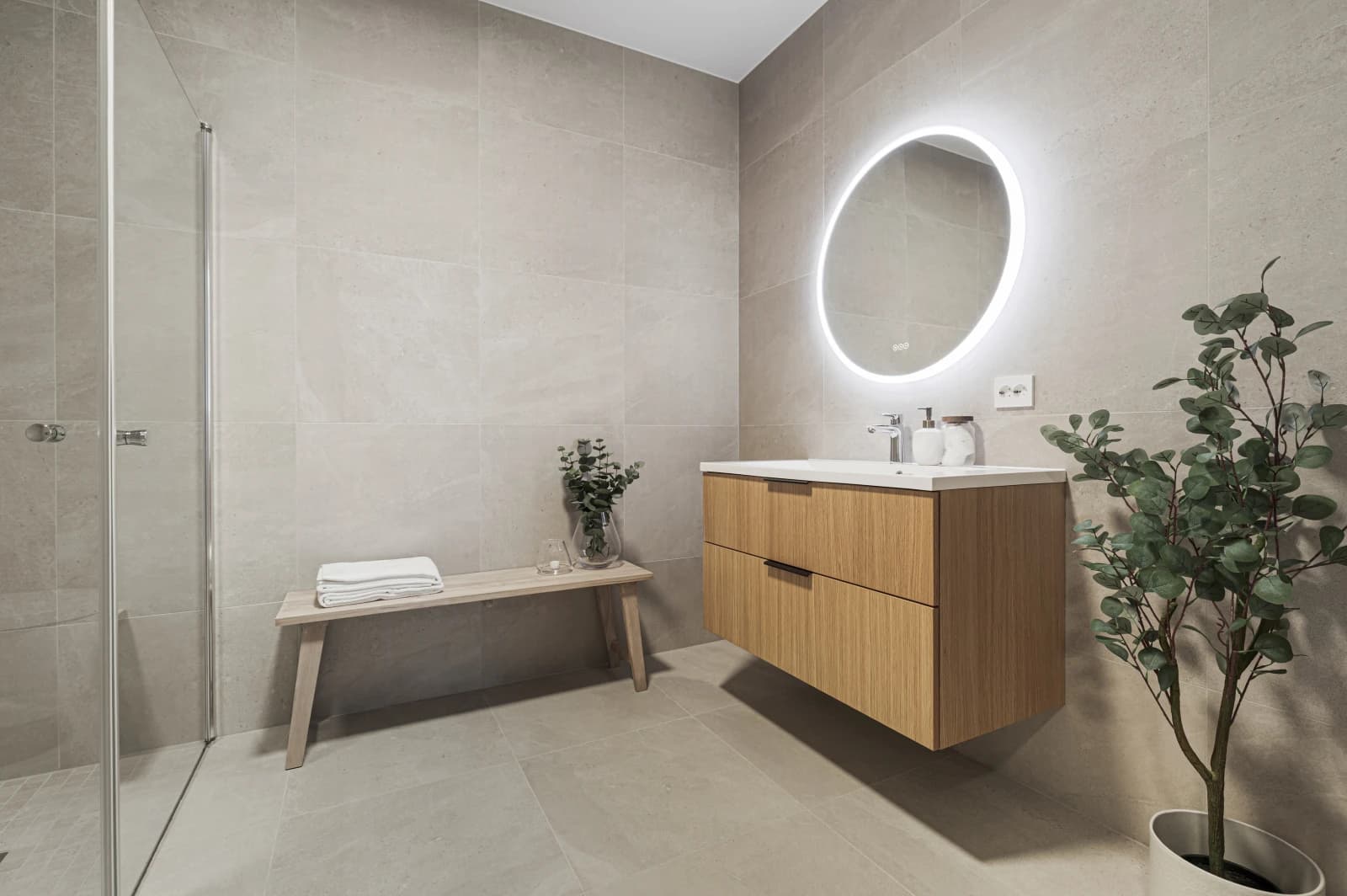 - Bad leveres ferdig flislagt med 60x60 cm flis fra Modena på vegger og gulv. Det kan fritt velges mellom 5 fargevarianter som inngår i flisserien. Dusjhjørne/-dør med profiler i krom og klart glass, mosaikkflis på gulv.