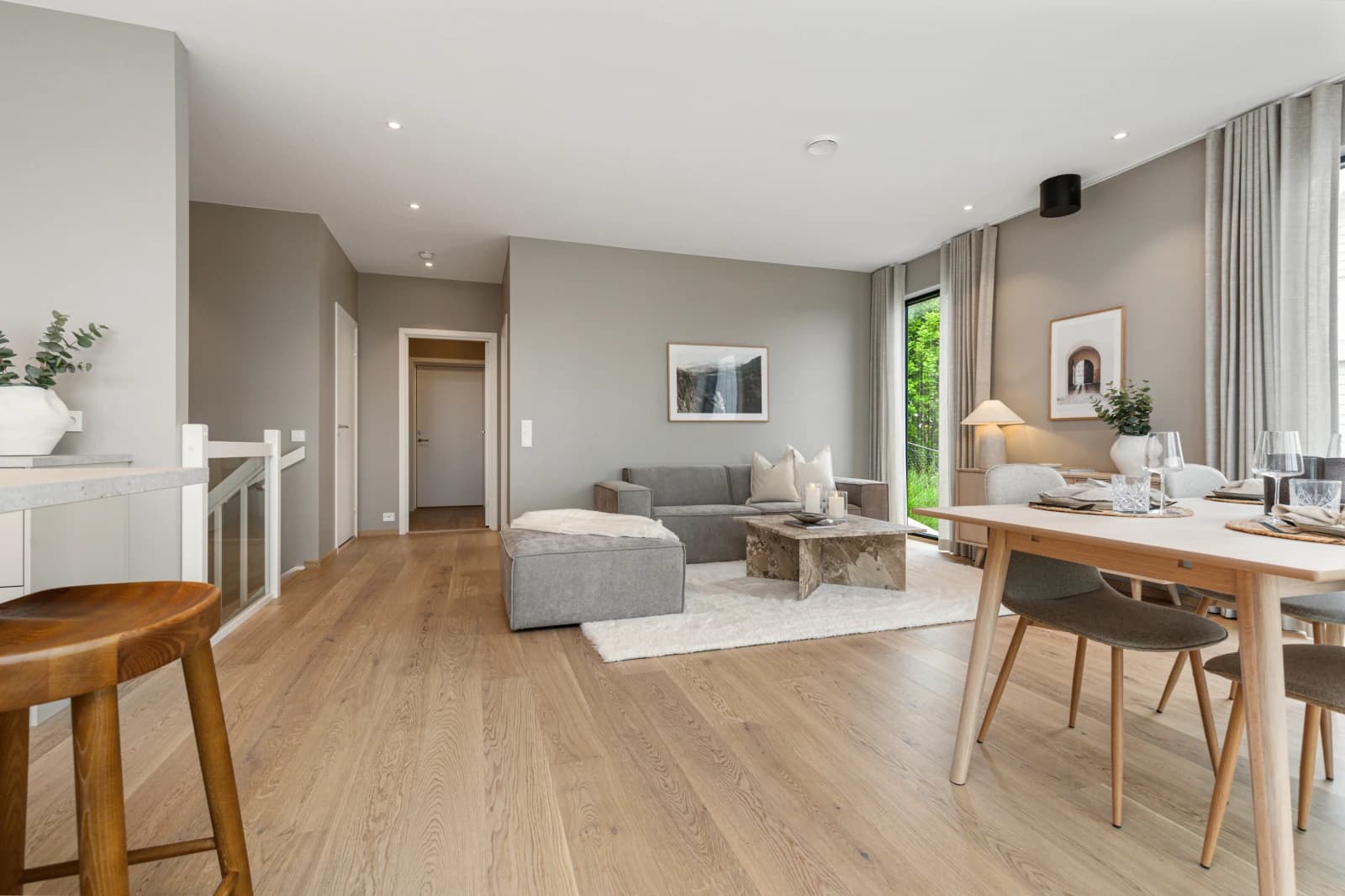 - 1-stavs eikeparkett av høy kvalitet levert på stue, kjøkken og soverom.