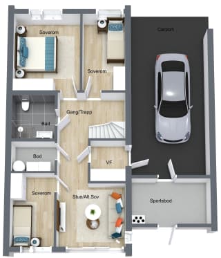 Boligene inneholder to stuer, kjøkken, tre soverom, to bad, inngangshall, gang/trapp, bod/vaskerom, uteplass/hage og egen parkeringsplass i carport med sportsbod i bakkant. På området er det tilgang til gjesteparkering og to flotte lekeplasser, med blant annet lekeapparater og benk.