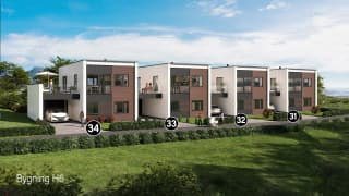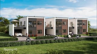 Det skal bygges totalt 7 eneboliger i kjede, fordelt på 2 bygninger. Dette er en spennende og moderne hustype i funkisstil, som er barnevennlig og med en god planløsning. Boligen går over to etasjer, og er på ca. 129 m2 BRA. Eneboligen har en stor stue- og kjøkkenløsning, som ligger i 2. etasje. Fra stuen er det dør ut til en stor terrasse, med plass til flere sittegrupper. Fra stuen i 1. etasje har man en dør som fører ut til egen uteplass på bakkeplan, med mulighet for hage, markterrasse eller lignende. Videre inneholder boligen tre soverom (med mulighet for fire) og to bad. Boligen har store vindusflater og ekstra takhøyde, som gir et lyst og moderne preg.