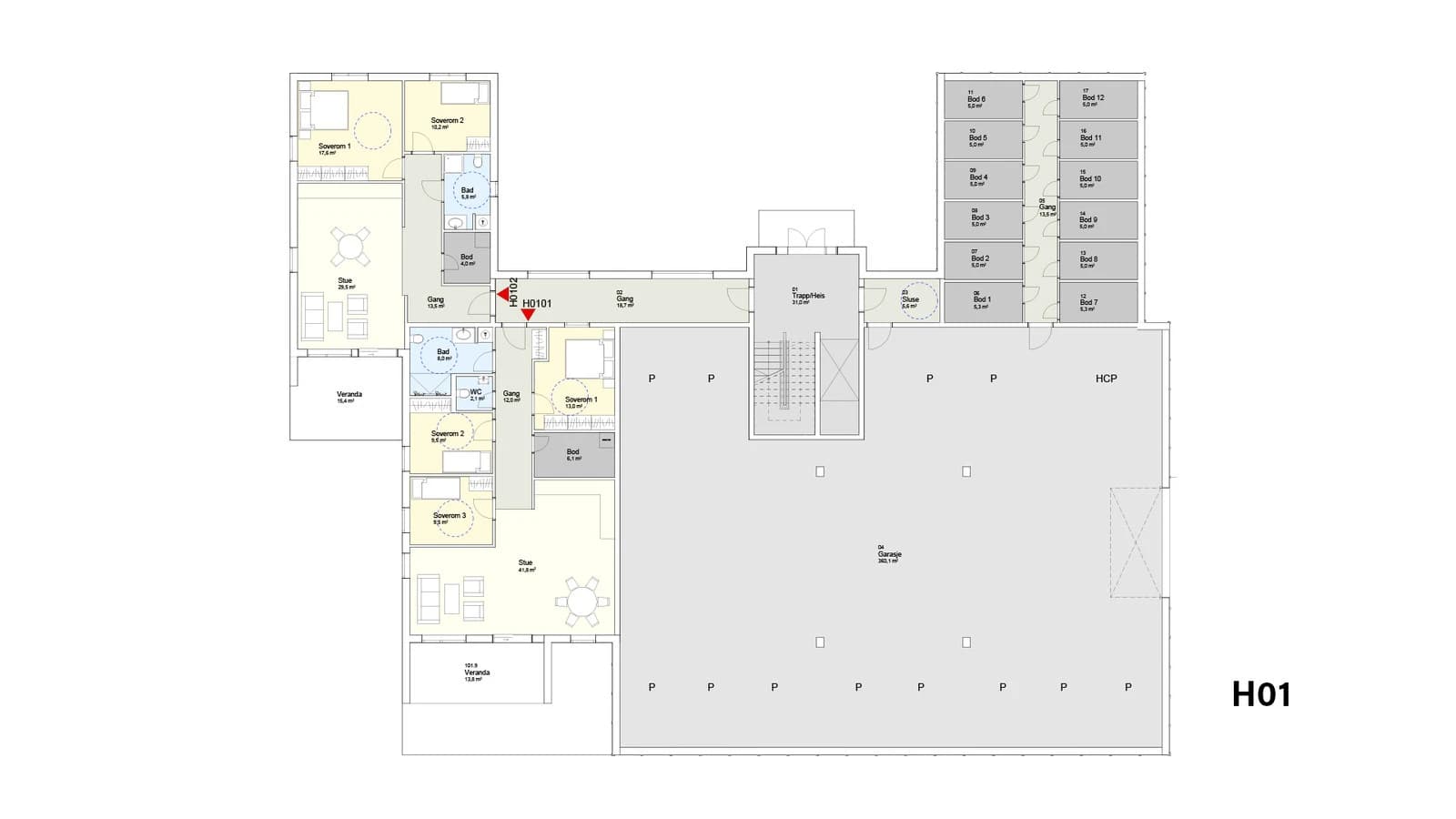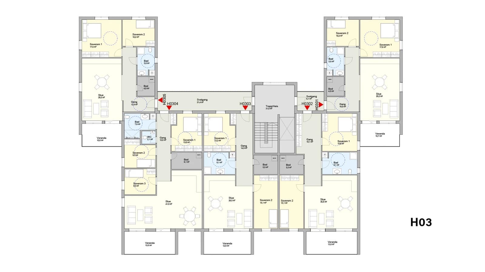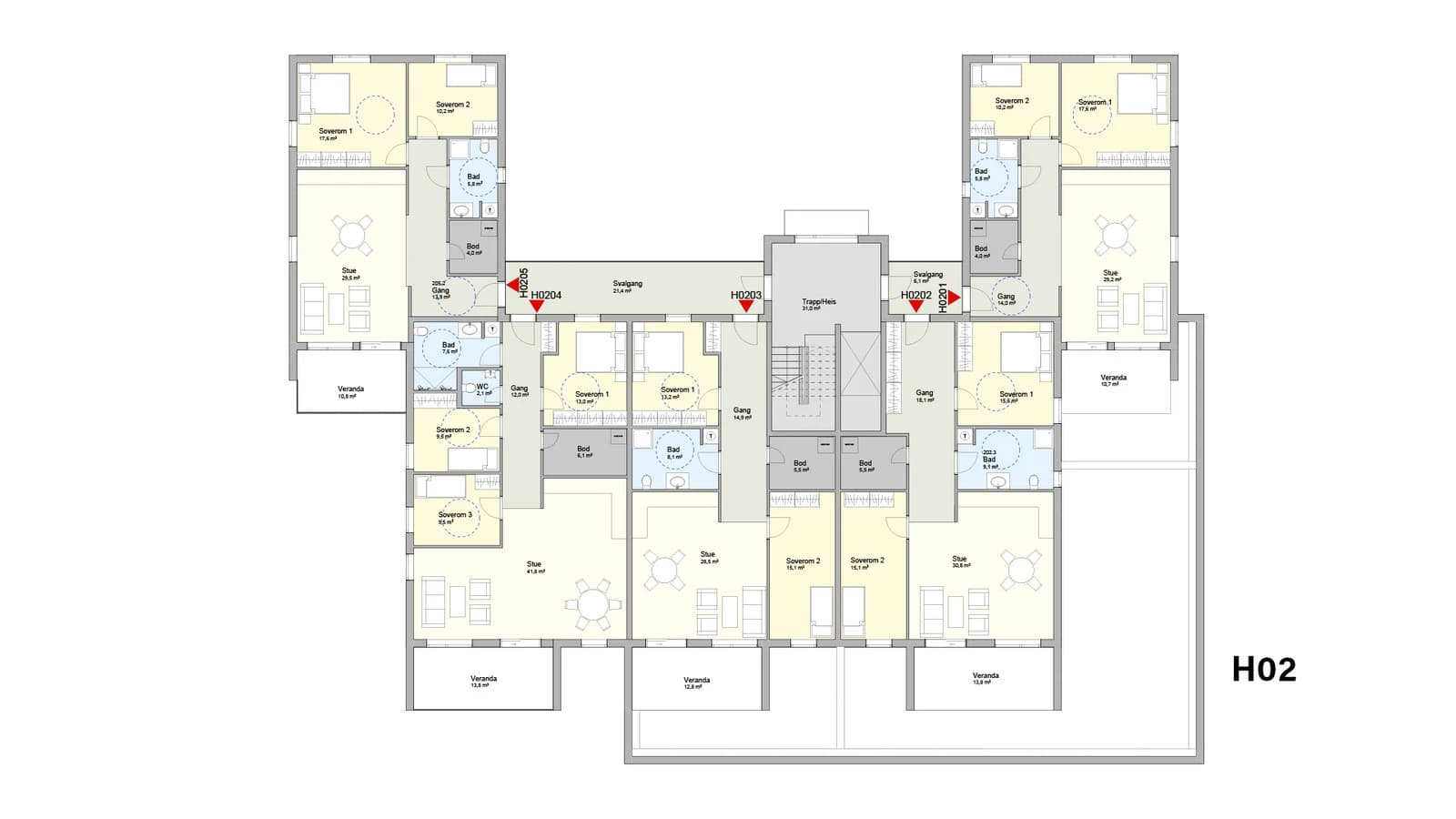 Fra 80 m² til 102 m²Kun en igjen med 3 soverom, de andre ledige har 2 soverom.