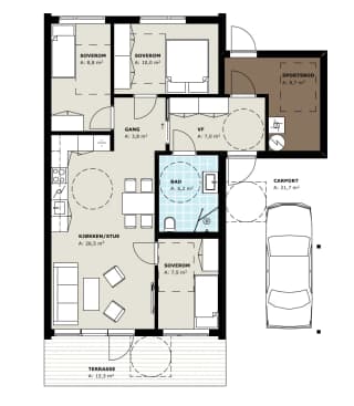 Arealeffektiv enebolig med 3 soverom og carport. Alt på ett plan!