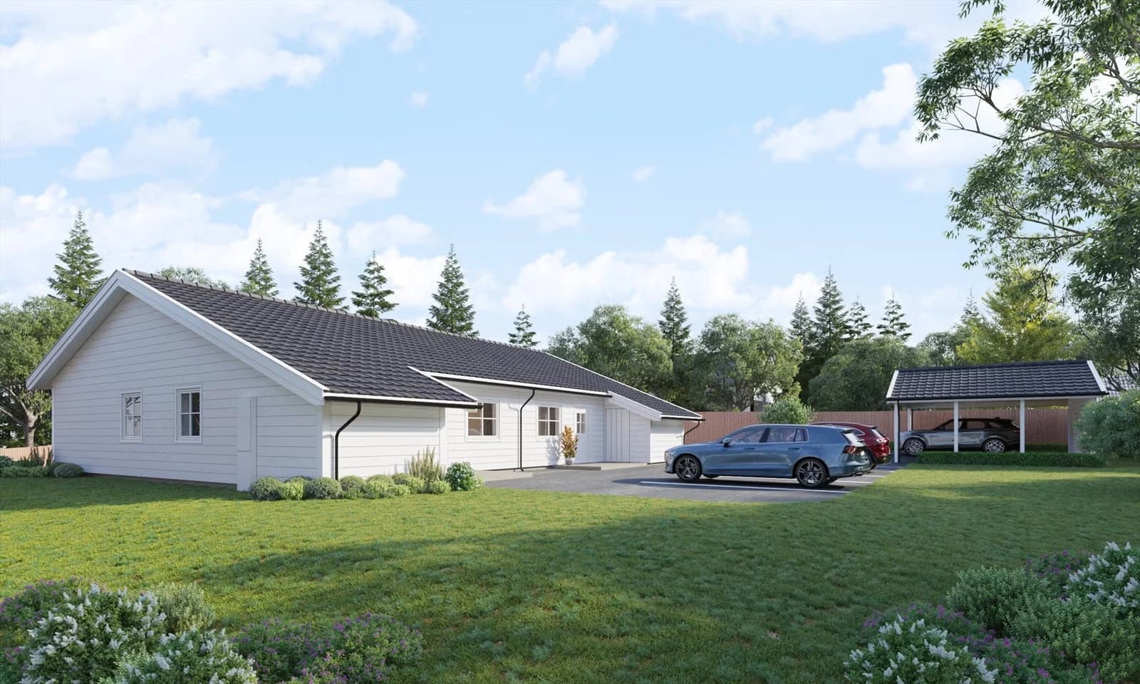 Her kan du gjøre egne valg og få bygget en halvpart nøyaktig som du ønsker! Husmodellen er en smart og energivennlig tomannsbolig med alle rom på bakkeplan. Hver enhet får en BRA på ca. 89 kvm. Planløsningen gir blant annet valget mellom to og tre soverom, helfliset bad, kjøkken fra Sigdal og luftig stue/spisestue. Peisovn for ekstra varme og hygge. Ute leveres gruset adkomst, biloppstilling, carport, utvendig bod og solrike uteområder.