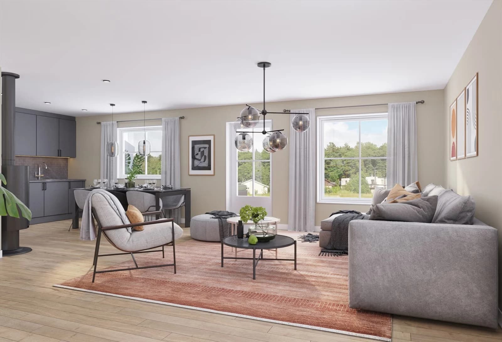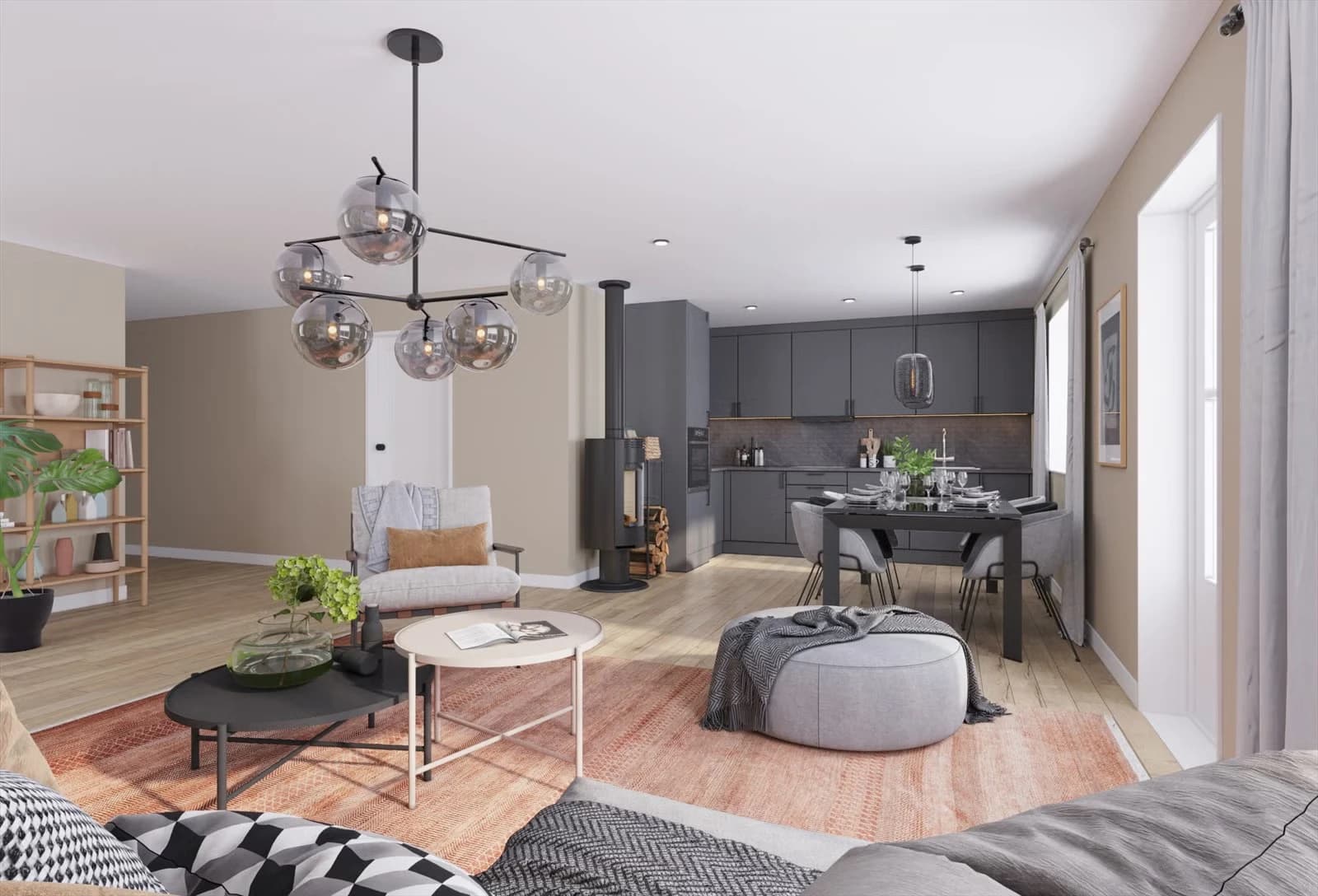 Hver leilighet leveres med stålpipe med vedovn. Ovnen kommer med skjult frisktluftstilgang, buet glass og høyt brennkammer.