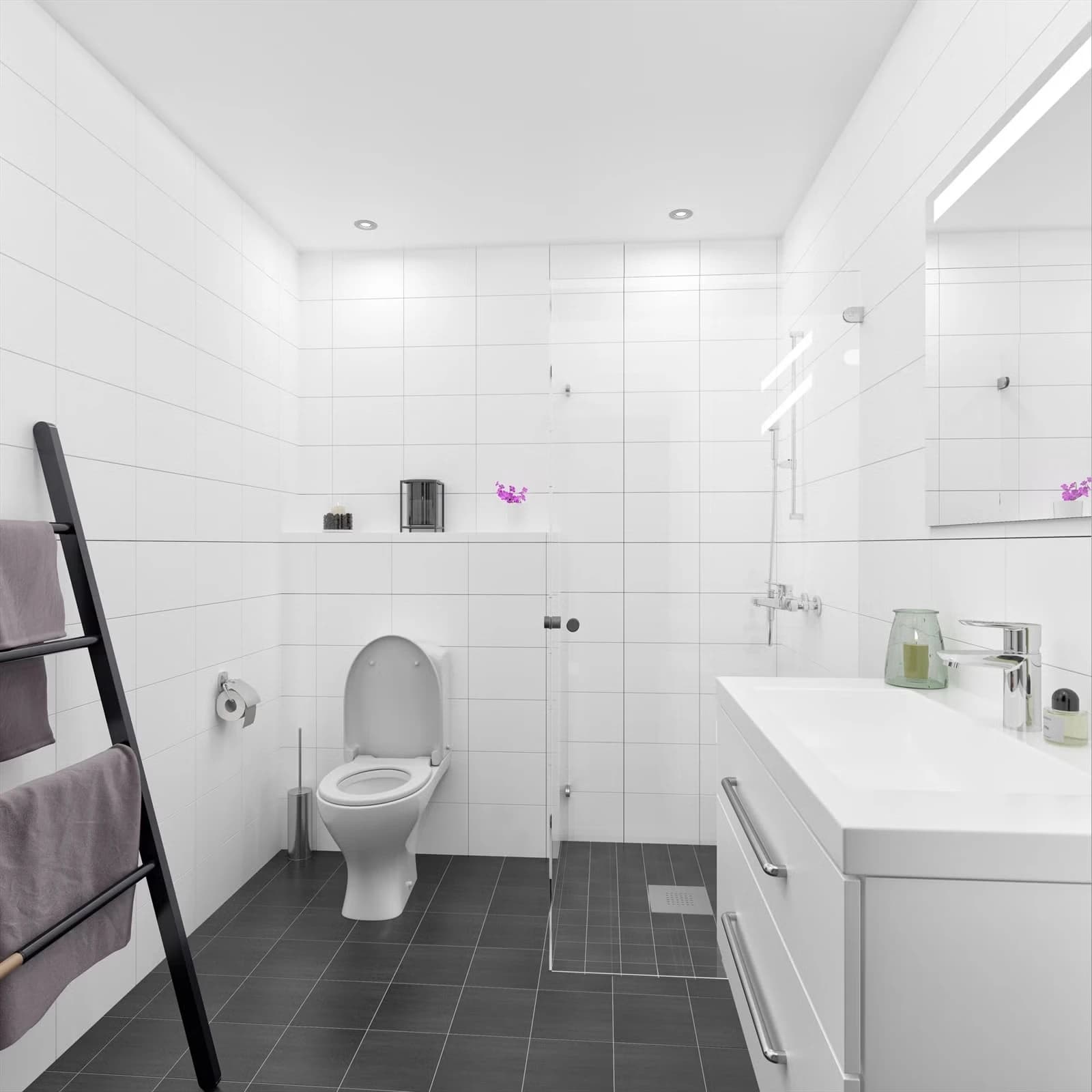 Bad/wc leveres med følgende standard: flislagte gulv med varme i grå fliser størrelse 20 x 20 (10x10 i dusjsone), flislagte vegger med flis 20 x 30. Videre leveres baderomsinnredning av typen Optima Venezia hvit med heldekkende servant og speil med integrert belysning. Det leveres vegghengt toalett, dusjdører og dusjutstyr, samt opplegg for vaskemaskin.