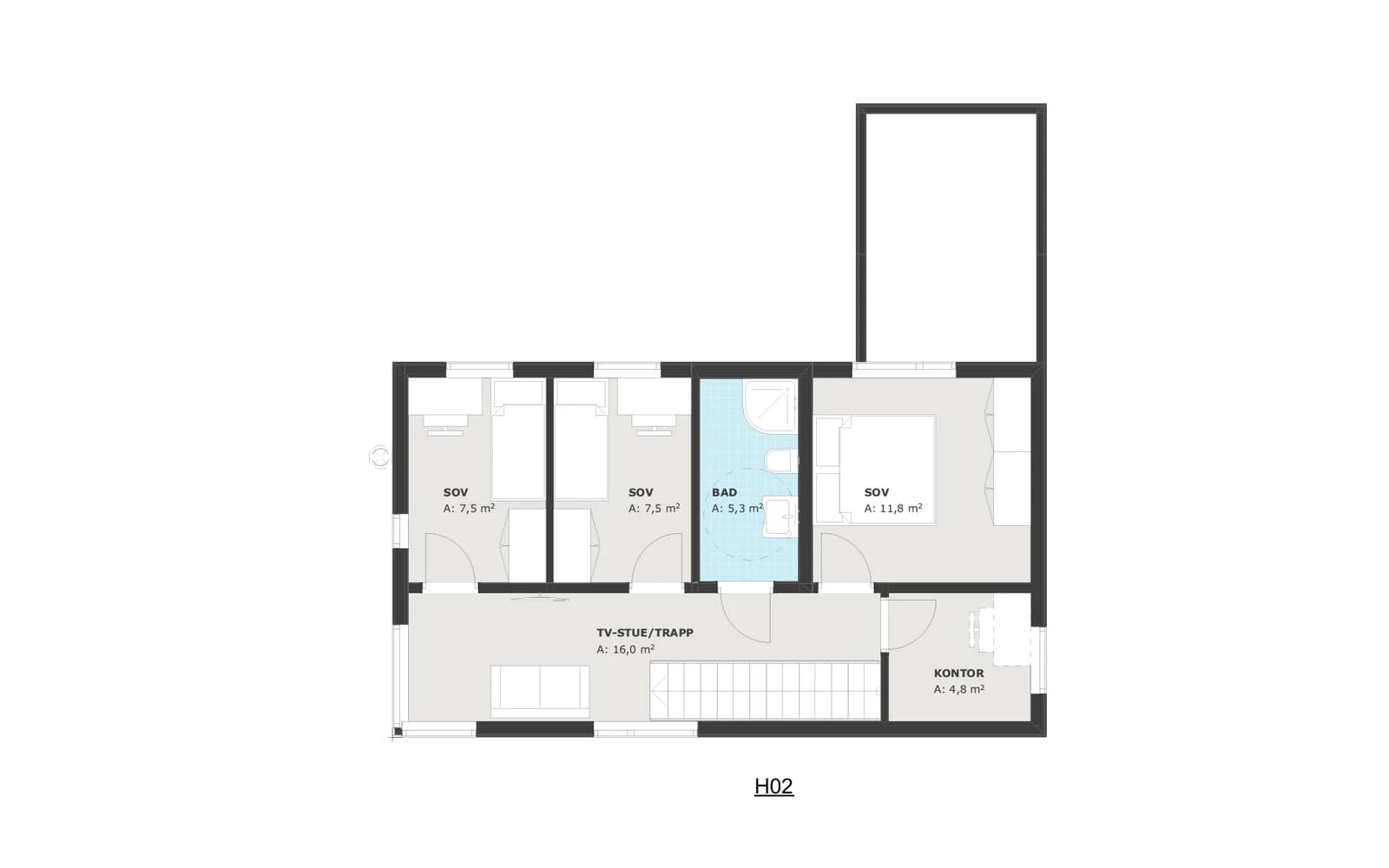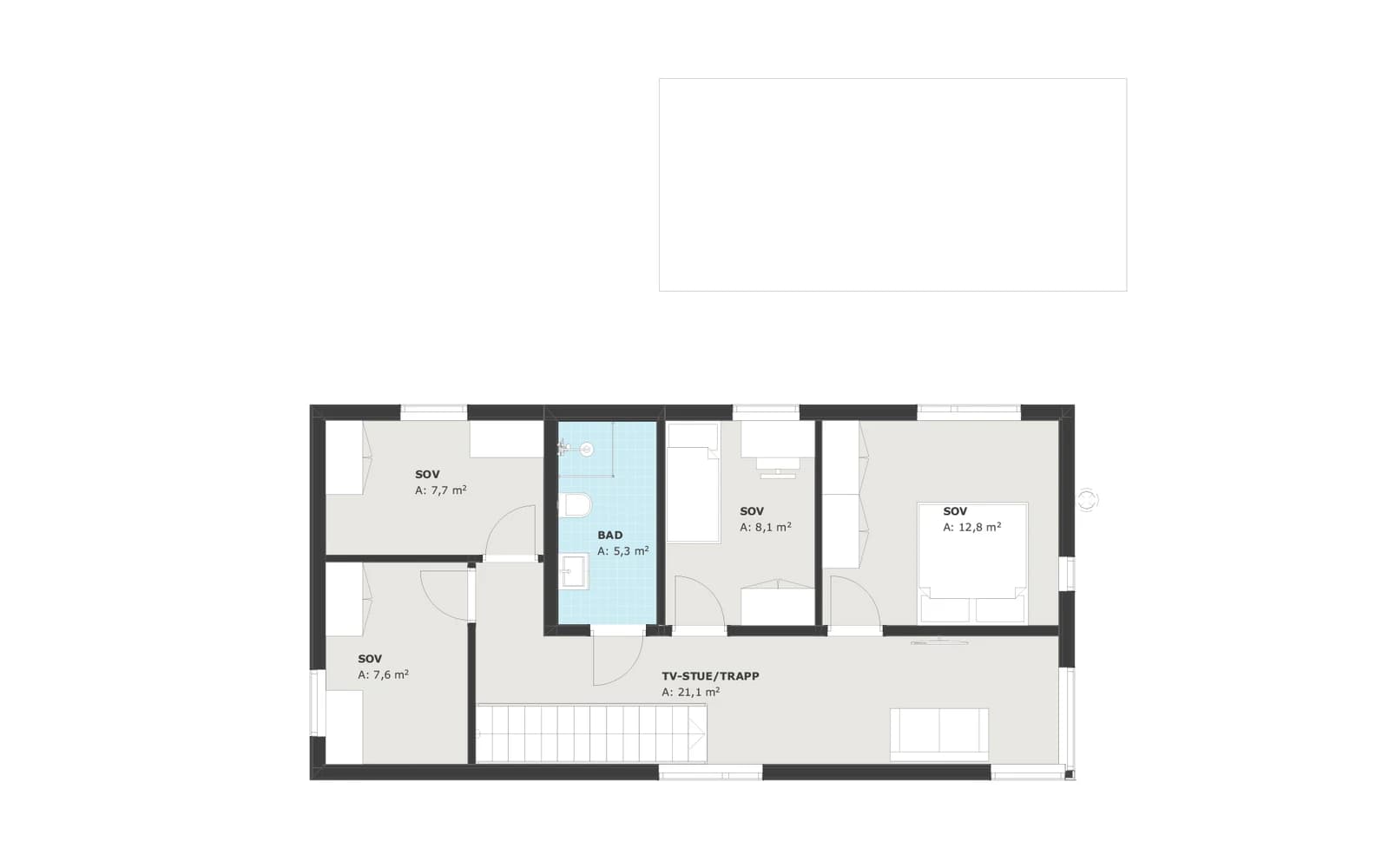 En rettløpstrapp fører opp til andre etasje, hvor du finner soverommene og en hyggelig liten TV-stue – et ekstra oppholdsrom som gir fleksibilitet i hverdagen.