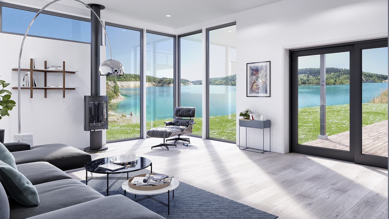 Flya er en enkel og minimalistisk funkis-inspirert bolig med flatt tak og store glassflater i alle rom. Den smarte T-formen på bygningskroppen skaper et naturlig skille mellom sovesone i den ene fløyen, og en sosial sone i den andre. Denne formen gjør også at du får en lun uteplass på verandaen. Boligen har til sammen 4 innganger, to fra veranda, én til vaskerommet og inngangsparti. Takhøyden på stue og kjøkken er stor, og med vinduer fra gulv til tak skaper det en utsikt helt utenom det vanlige.